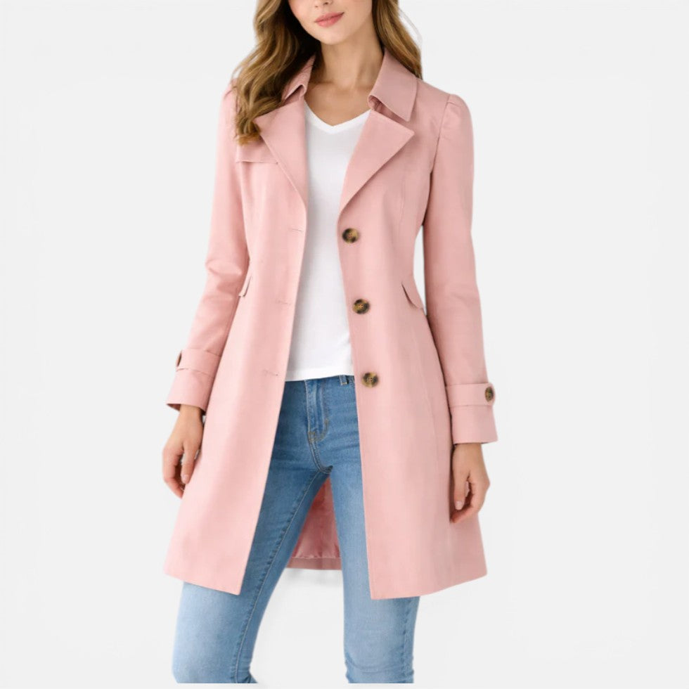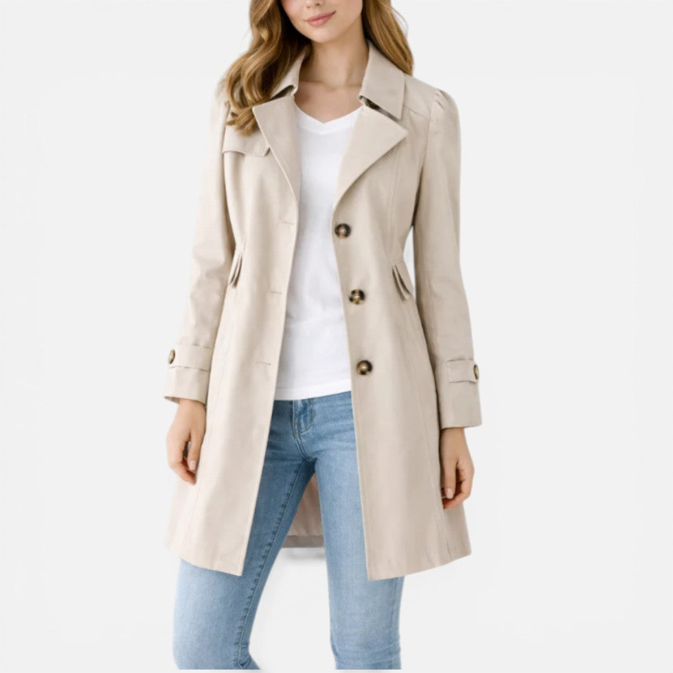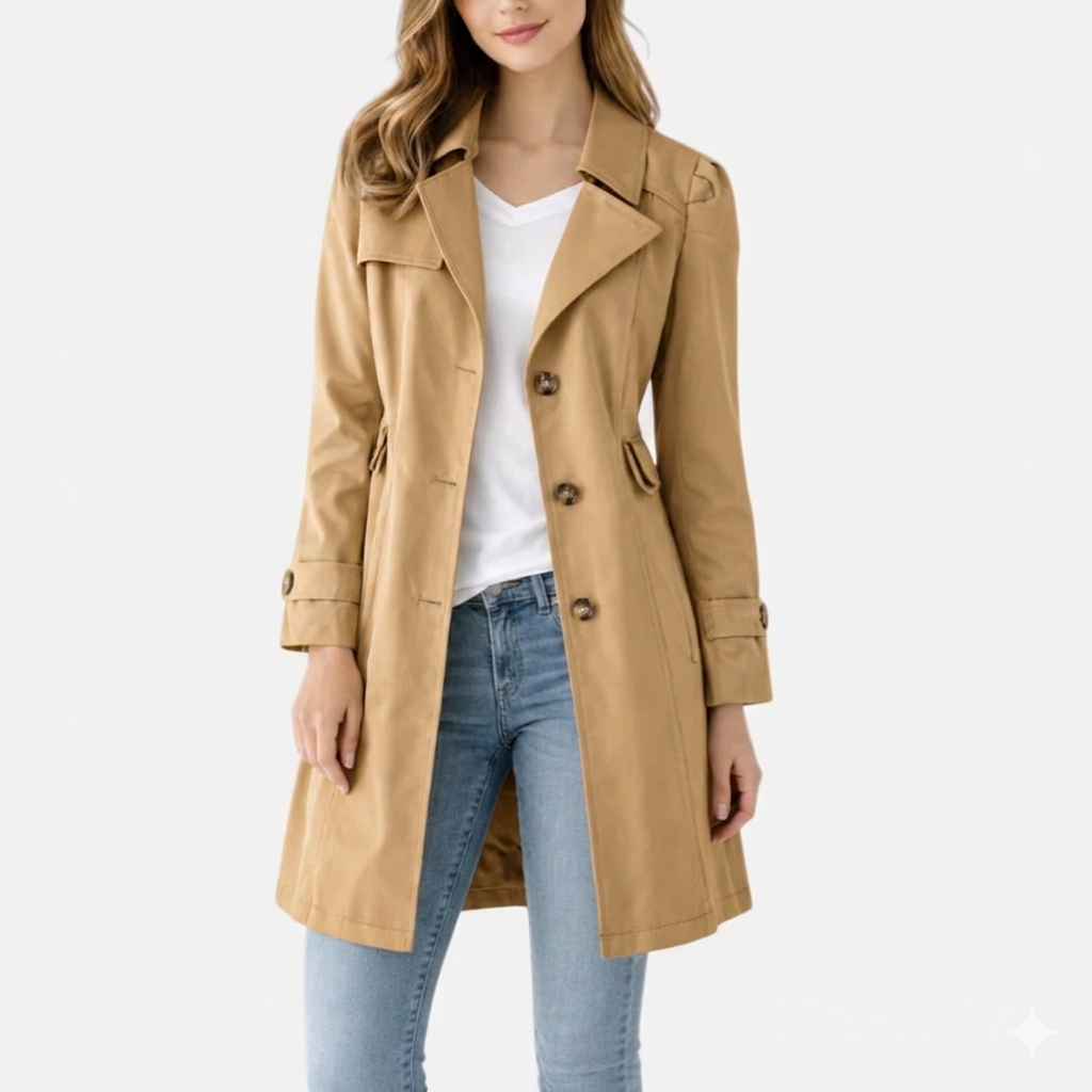 This classic trench coat is designed with a structured silhouette and a clean, tailored finish. Featuring a button-up front, soft lapel collar, and subtle waist shaping at the back, it offers a balanced look suitable for both casual and smart styling. The lightweight woven fabric allows for comfortable layering across seasons, while the knee-length cut creates a streamlined profile. It pairs easily with denim, dresses, or workwear.
